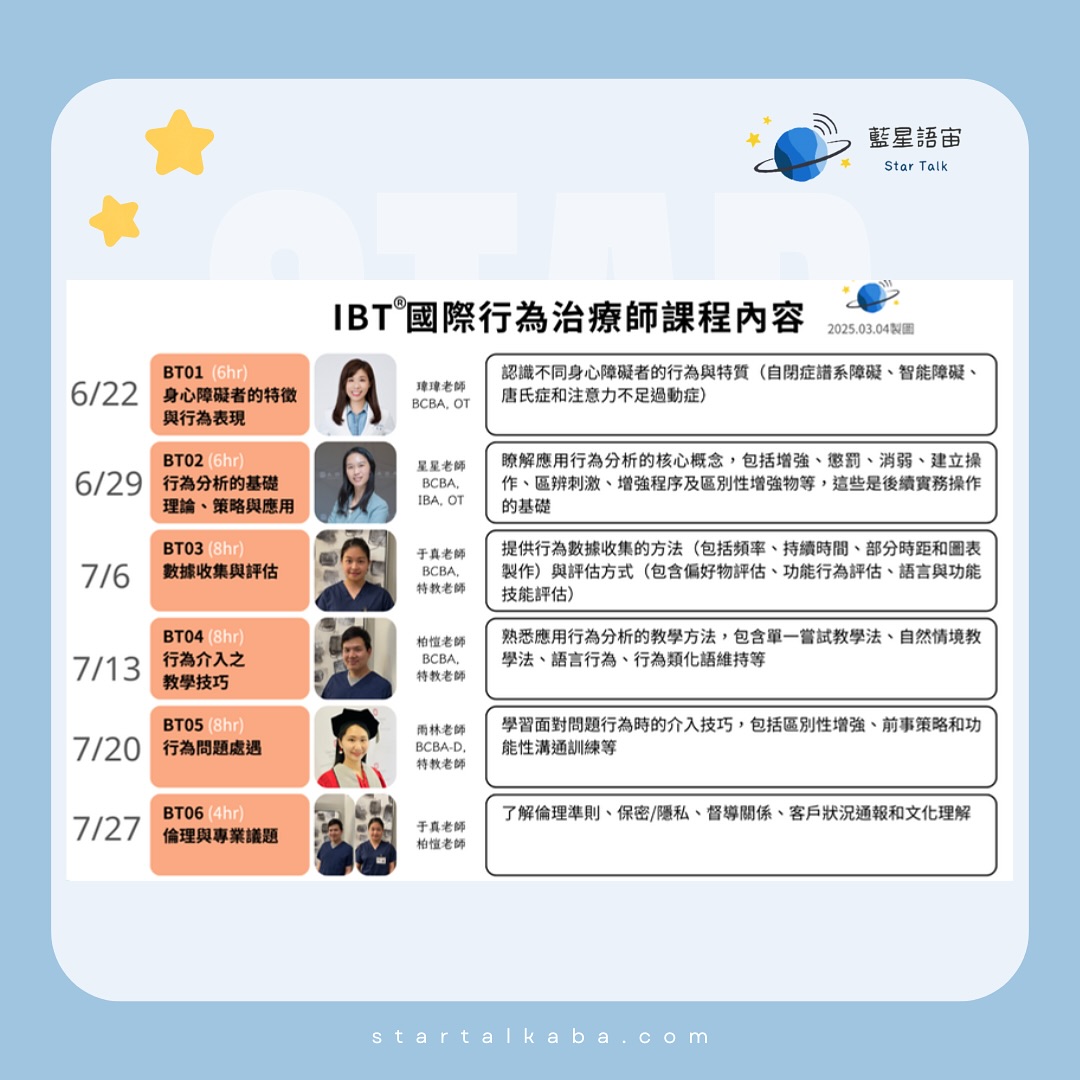 台美經驗滿滿的分析師-于真老師 / 講者 / 2025-05-10 藍星語宙IBT行為治療師講師介紹 part4!!!! 還沒看part1, 2, 3的趕快去看喔! 這次要來隆重介紹! 藍星語宙申請計劃書的重要人物- @meet_yuchen_bcba 台美經驗滿滿的于真老師 擅長大齡個案問題行為處遇+服務年齡層超廣! 想成為國際化治療師嗎? 想學習美國一手的ABA干預方式嗎? 千萬別錯過跟于真老師學習的機會! 趕緊點擊下方連結 報名課程 https://www.startalkaba.com/courses/ibt01/ 包含十小時的直播團體督導時間 其中就有機會和于真老師直接提問和討論個案喔! #藍星語宙 #startalkaba #行為治療 #IBT #BCBA #ABA #IBAO #國際行為分析組織 #美國 #行為問題