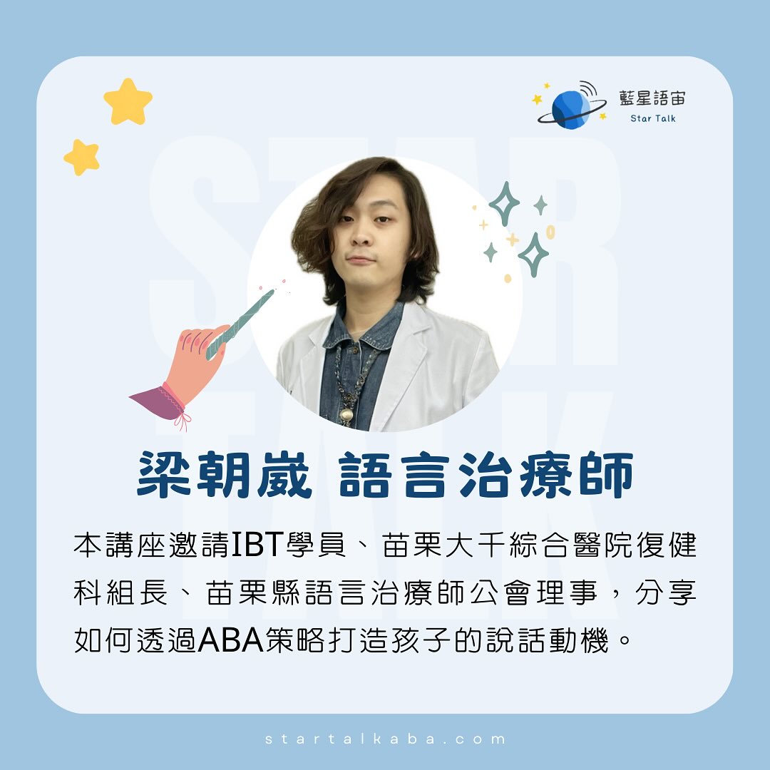 本講座特別邀請第一期IBT學員、苗栗大千綜合醫院復健科組長 @stylebyliang 分享如何透過ABA策略打造孩子的說話動機。