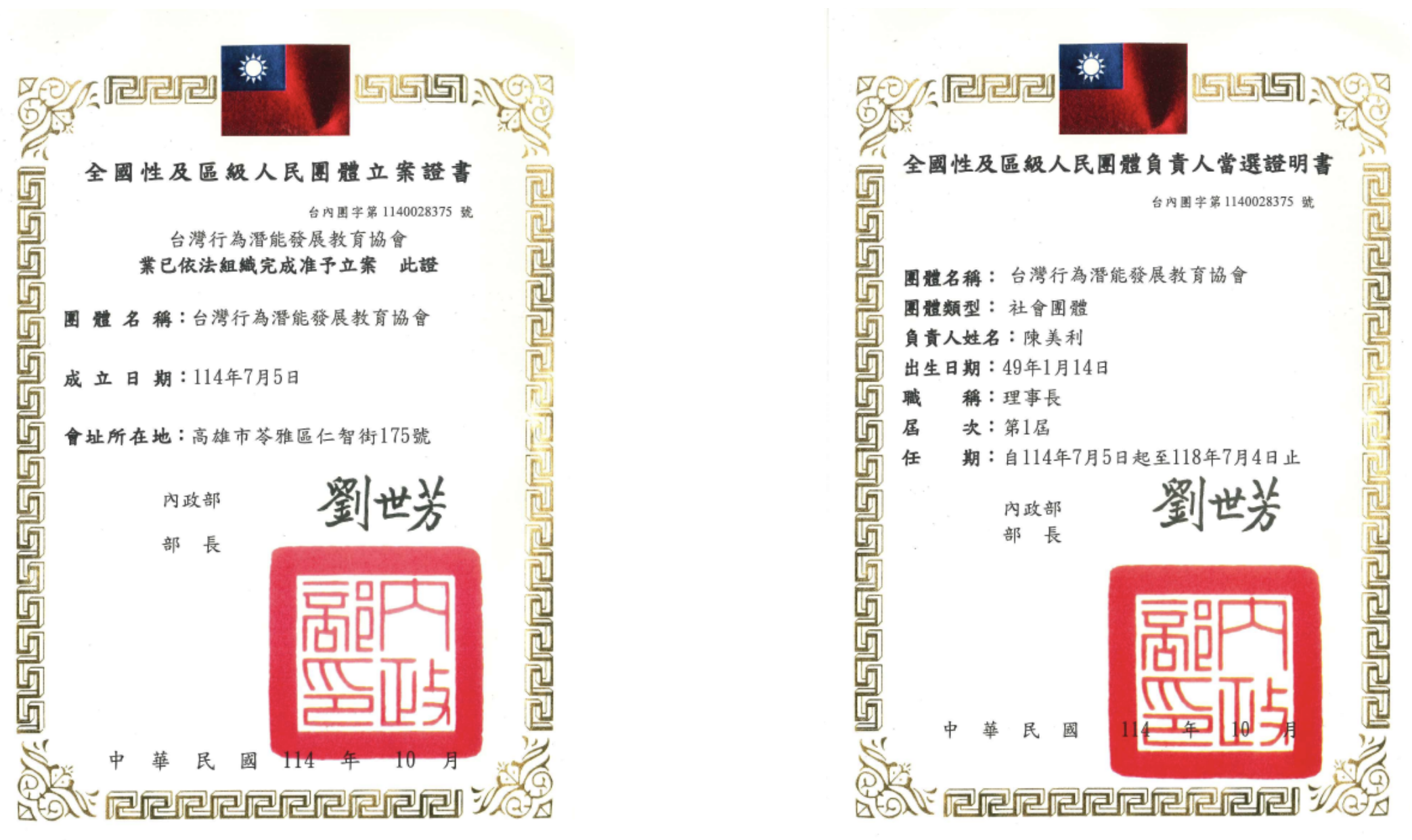 感謝所有親朋好友的支持與協助,讓「社團法人台灣行為潛能發展教育協會」正式成立!💪✨