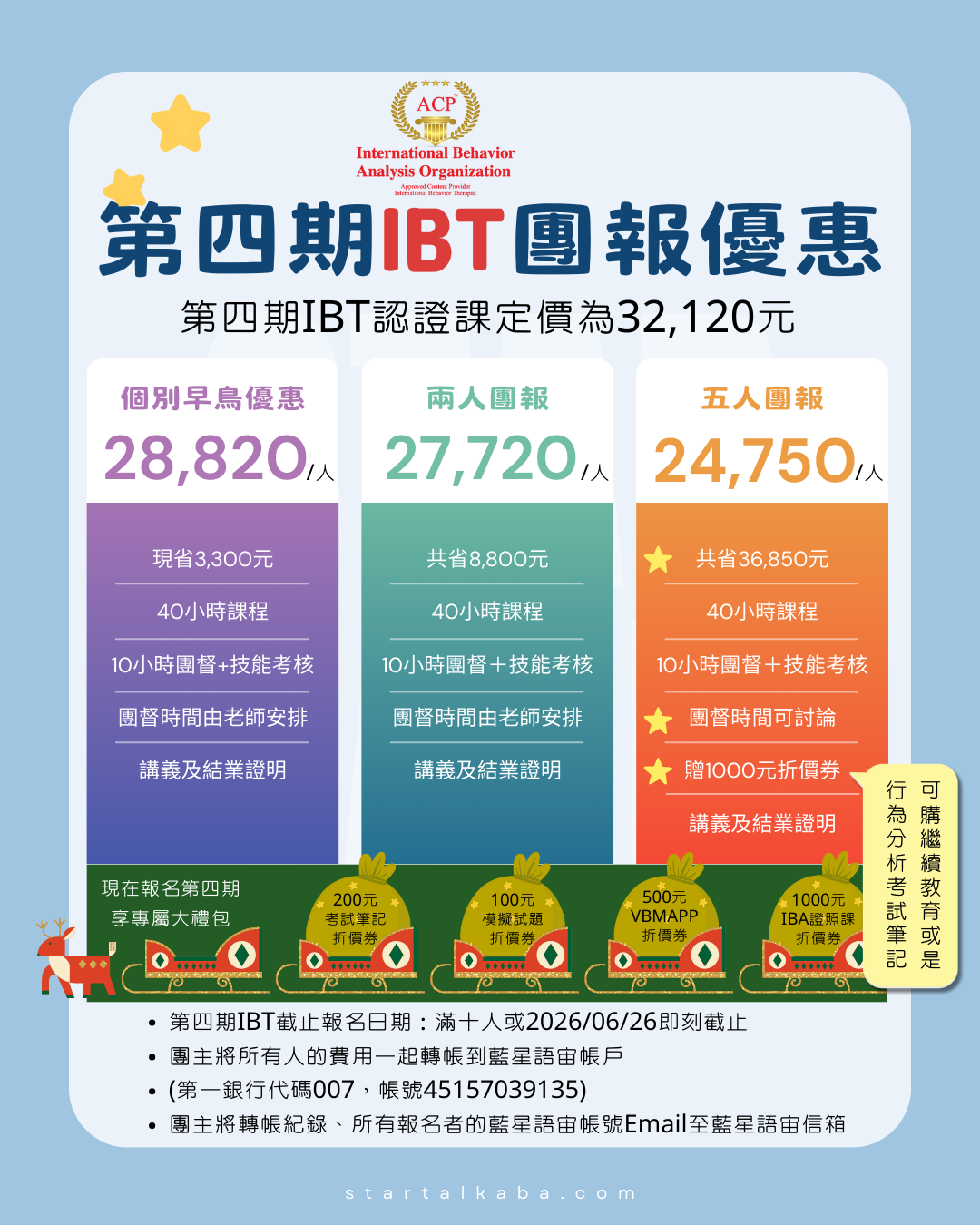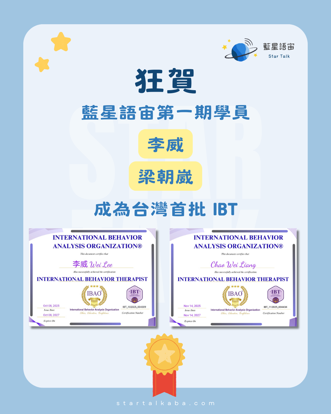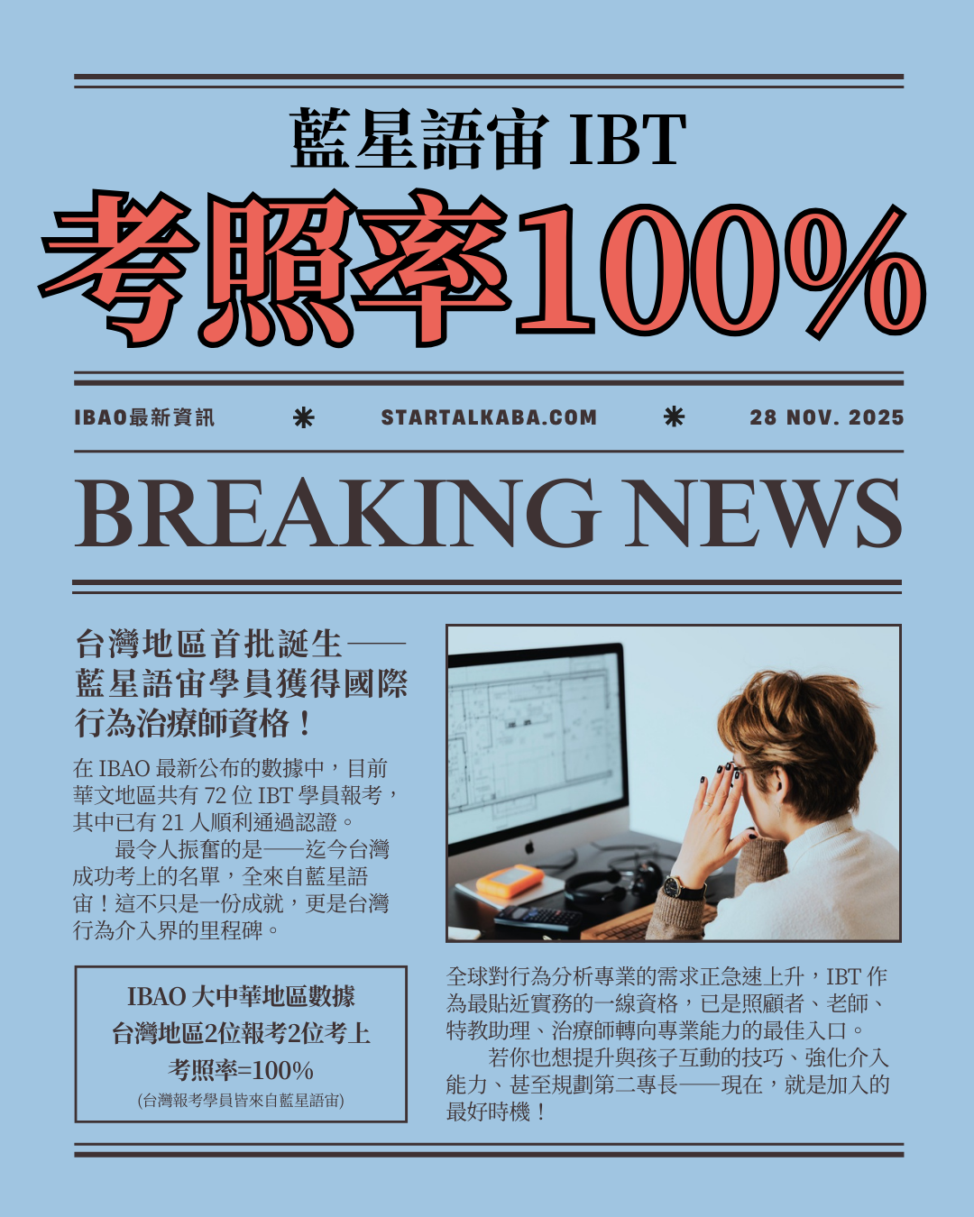 對IBT®國際行為治療師考照有興趣,歡迎觀看免費說明會,註冊帳號後可回放,以及說明會PPT會放在本平台:https://www.startalkaba.com/courses/ibao-ibt-5000/