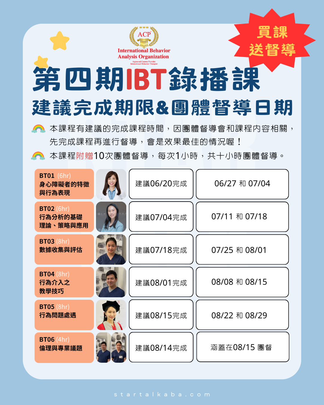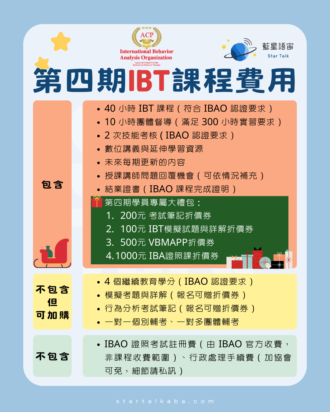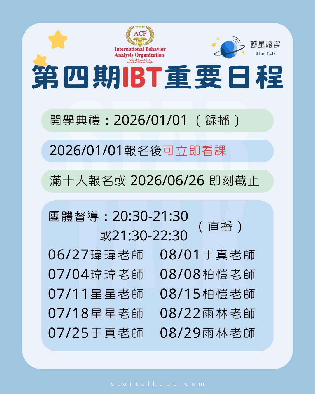 對IBT®國際行為治療師考照有興趣,歡迎觀看免費說明會,註冊帳號後可回放,以及說明會PPT會放在本平台:https://www.startalkaba.com/courses/ibao-ibt-5000/